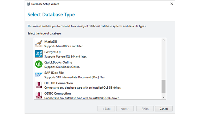 支持超过20种主要的数据库和数据文件类型,包括MS SQL、Excel/Online、QuickBooks Online、Access、XML、JSON、CSV以及IBM DB2。